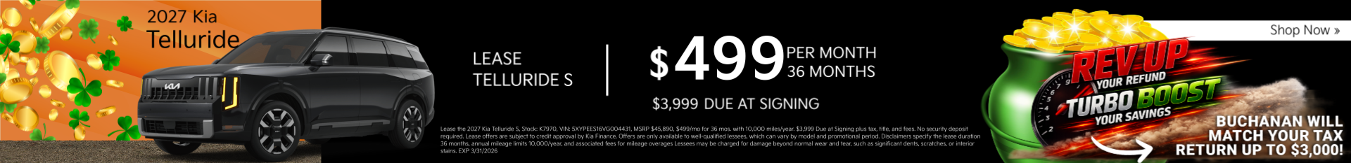 No matter what your automotive needs may be, you will find answers here at Buchanan Kia. This 2027 Kia Telluride X-Line EX has a beautiful Wolf Gray exterior with Black interior.…No matter what your automotive needs may be, you will find answers here at Buchanan Kia. This 2027 Kia Telluride X-Line EX has a beautiful Wolf Gray exterior with Black interior. This vehicle has 0 miles has been thoroughly inspected by our factory trained service technicians and has been fully reconditioned for immediate delivery. This vehicle includes:Convenience GPS linked cruise control - Set it and forget it. Road trips used to be stressful, until GPS linked cruise control set the pace. Simply set the desired speed and the system uses GPS navigation data to maintain that speed without driver intervention - including slowing down for curves and anticipating hills. This can help minimize driver fatigue and improve overall fuel economy. Meet your ultimate co-pilot; GPS linked cruise control.Safety and Security Pedestrian impact prevention - An extra step toward safety. Pedestrians don't always stop, look, and listen, but with Pedestrian Impact Prevention, your vehicle is equipped to better see them and avoid them. This system constantly monitors the road ahead to identify and track pedestrians. It projects that image to an interior display screen, AND should an impact become likely, Pedestrian impact prevention takes steps to avoid a collision. Rear camera with washer - Watching your back! The rear camera helps you see obstacles and hazards you otherwise couldn't by showing enhanced images of what is behind you. Even if there are sloppy conditions, the washer keeps the camera's view clean. Rear camera with washer is an extra set of eyes that's both convenient and safe Lane departure prevention - Keep it between the lines. It only takes a moment of inattention for your vehicle to drift. With lane departure prevention, your vehicle takes corrective action to help you avoid unintentionally moving out of your lane. Lane departure prevention is an extra level of safety for you and those around you. Rear collision mitigation - It has your back. Rear collision mitigation uses sensors to monitor the area behind you. If it senses an impending crash, it activates certain features to help prevent a collision or reduce the severity of it. Put your worries behind you with rear collision mitigation.Technology and Telematics Smart device mirroring - Smartphone, meet smart car. You can control your device through your vehicle's infotainment system. Smart device mirroring brings together safety and convenience by making it easier to find what you're looking for while keeping your eyes on the road. Mobile hotspot - WiFi on the fly. Connect your devices to the Internet through your vehicle's private mobile hotspot and take the internet wherever your journey takes you, without eating up your data allowance. Find the hotspot with mobile hotspot. For a quick, stress-free car buying experience you've come to the right place! Buchanan KIA offers a complimentary 10 year/ 100,000 mile powertrain warranty on all new vehicles in addition to any factory warranties. Due to heavily discounted market based pricing, vehicles are selling more quickly than our website updates. To verify availability or place a deposit on this vehicle please contact our client care team at 410-876-2251 Our address is 119 Railroad Ave Westminster MD 21157.(more)| Mileage | |